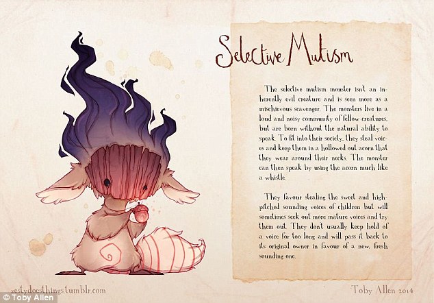 “Il mostro del mutismo selettivo non è una creatura intrinsecamente malvagia ed è maggiormente considerata come un predatore birichino. Il mostro vive in una comunità rumorosa e chiassosa di creature a lui simili, ma nasce senza l’abilità naturale di parlare. Per inserirsi nella società, ruba le voci altrui e le tiene nel guscio di una ghianda che indossa intorno al collo. Il mostro può parlare utilizzando la ghianda come se fosse un fischietto.