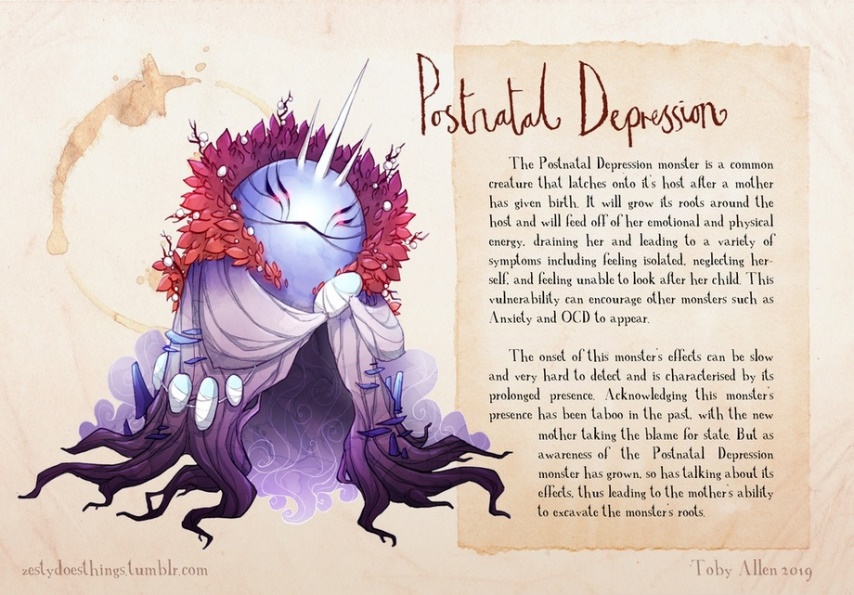 “Il mostro della depressione post partum è una creatura comune che si attacca al suo ospite dopo che una mamma ha partorito. Le sue radici crescono intorno all’ospite e si nutrono della sua energia fisica ed emotiva, prosciugandola e portandola a presentare sintomi che possono spaziare dal sentirsi isolata, trascurare se stessa e sentirsi incapace di prendersi cura del proprio figlio. Questa vulnerabilità può anche portare all’apparizione di altri mostri come quello dell’ansia e del disturbo ossessivo compulsivo.